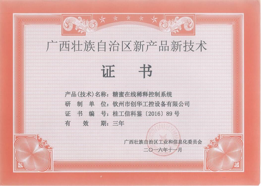 糖蜜在線稀釋控制系統(tǒng)新產(chǎn)品證書